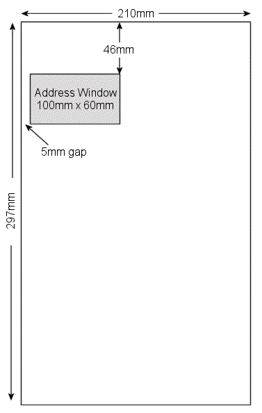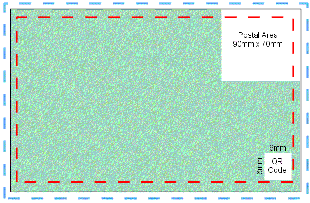 The Postal Area (White blank space) for the recipient's address & postmark and the Matrix QR returns tracking code (Bottom right corner) must both be left completely clear so that automatic sorting equipment can read.